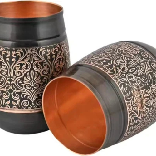 Experience the perfect fusion of style and health with our Black Printed Copper Glass. Crafted from 100% pure copper and adorned with intricate black prints, this glass adds a touch of elegance to your dining table. Copper is known in Ayurveda for its numerous health benefits, including improving digestion, boosting immunity, and promoting overall wellness. The printed design enhances visual appeal, making it ideal for both everyday use and gifting. Durable, eco-friendly, and easy to maintain, this glass is a smart choice for health-conscious individuals who also value aesthetics. Elevate your hydration routine in style.
