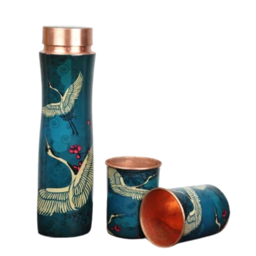 The Teal Green Printed Copper Bottle Glass Set is a stunning fusion of traditional health benefits and contemporary design, crafted for those who value both wellness and aesthetics in their lifestyle. This exquisite set includes a beautifully printed copper bottle paired with matching glasses, each showcasing a vibrant teal green hue that exudes freshness and sophistication.